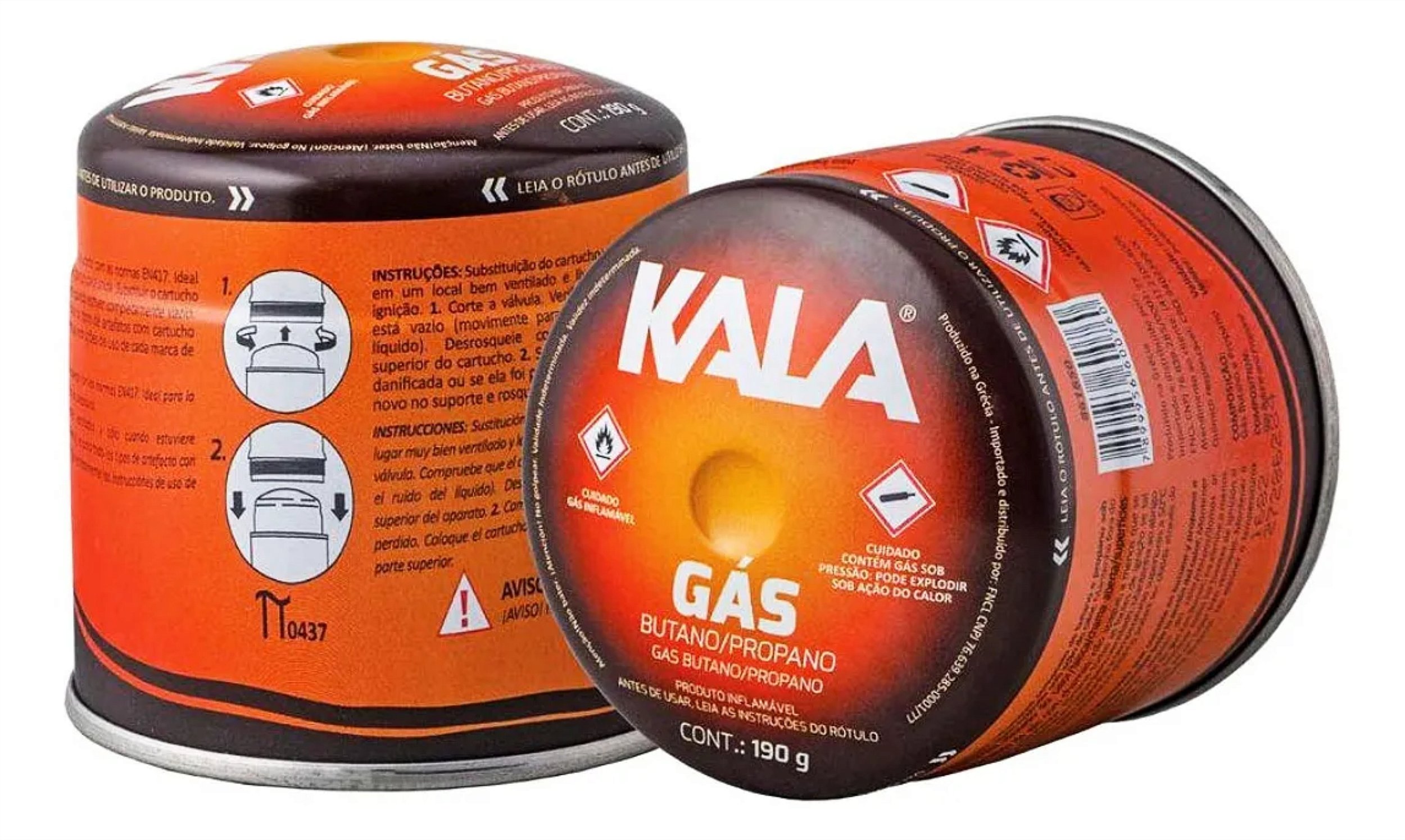 Cartucho Gás 190g Kala Cartucho de Gás 190 G da marca Kala se trata de um cartucho universal de gás Butano / Propano com 190 g, que pode ser usado com todos os tipos de artefatos compatíveis com cartucho de gás. Ele é ideal para uso em fogareiros, lampião a gás, maçarico para solda, entre outros. - Cartucho universal, serve para todos os tipos de artefatos com cartucho tipo perfuração; - De acordo com as normas EN417; - Ideal para: Fogareiro, Lampião a Gás e Maçarico Soldador.