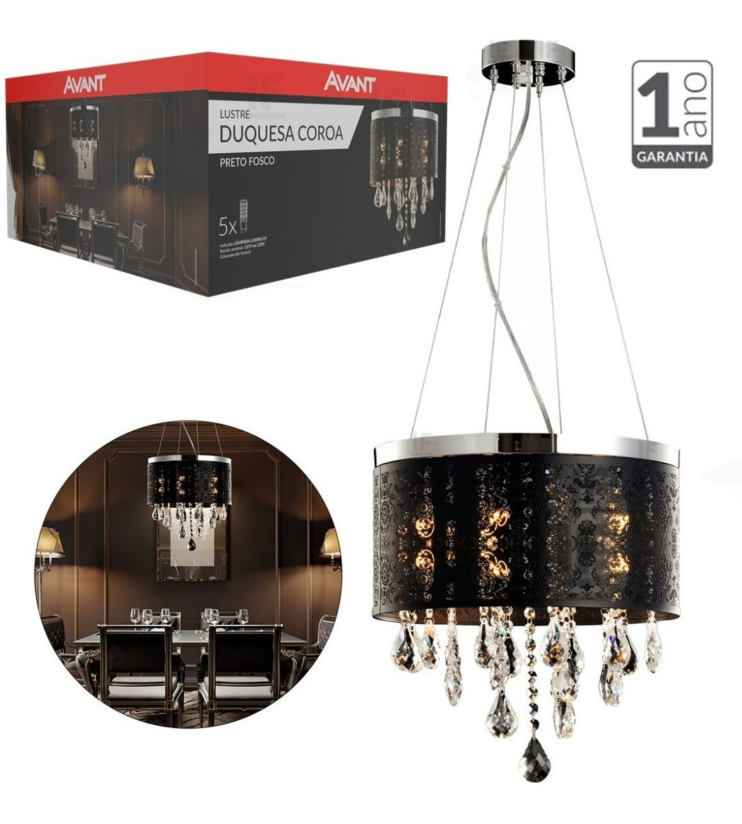 O clássico e o moderno nunca estiveram tão próximos. Com design diferenciado e o propósito de trazer elegância e refinamento ao seu ambiente, o lustre Duquesa é a fusão perfeita entre os dois estilos. Indicação de uso: Lojas, Boutiques, Restaurantes, Hotéis, Salões de Beleza, Sala de Estar e Sala de Jantar. - Dimensões A: 400 mm B: 145 mm - Peso: 3350g - Base: G9 - otência: 5 x 15w - Quantidade de Lâmpadas: 5 Uni CARACTERÍSTICAS › - Cúpula em aço nas cores: preto fosco - Pingentes em acrílico - Lâmpada indicada: Luxpin G9 - Marca: Avant - - Ref: 340115826